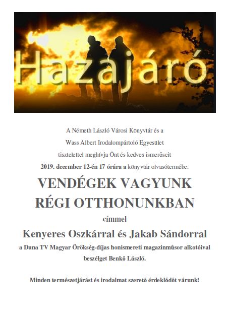 2019. december 12-én rendhagyó találkozón láttuk vendégül a „Hazajáró” tévéműsor két szereplőjét ...és ...-t. A program annyiban kapcsolódik az irodalmi körünk szellemiségéhez, hogy a műsor határon túli magyar helyszíneket mutat be, hozzá csatlakoztatva az adott helyre vonatkozó irodalmi idézetekkel.